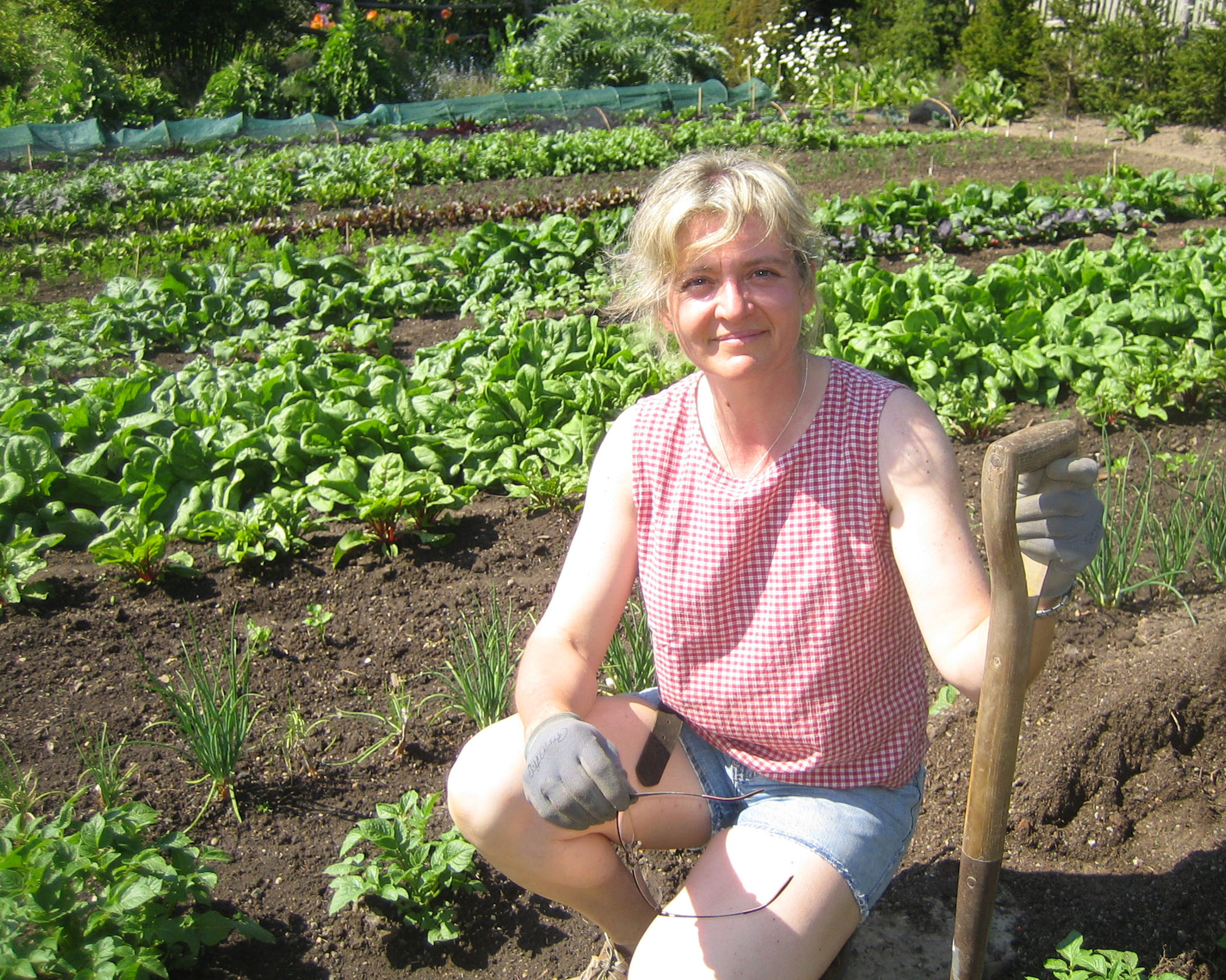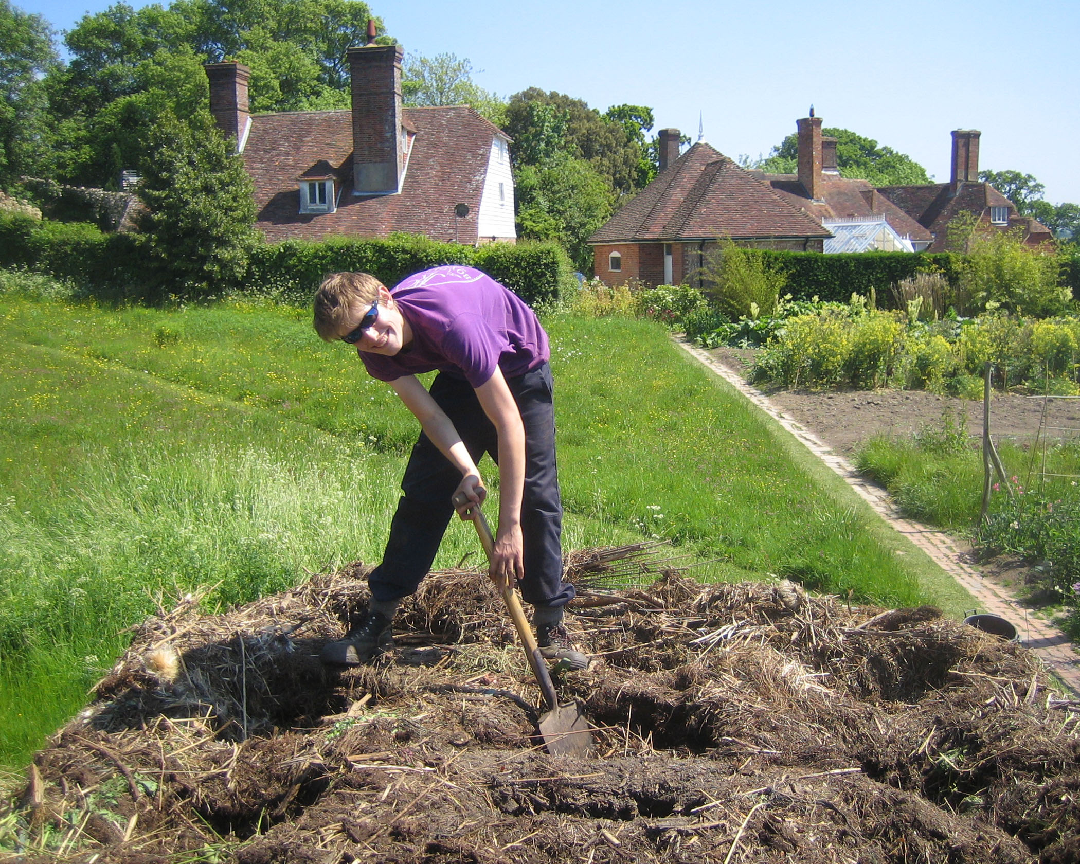 Oli was digging holes in the compost heaps, which could be then filled with compost, ready for 2 gourds to be planted in each hole. In this huge compost heap, he prepared 27 holes! As the gourds grow they will decoratively hangdown the sides of the compost heaps during summer and will then be ready to harvest in Autumn.