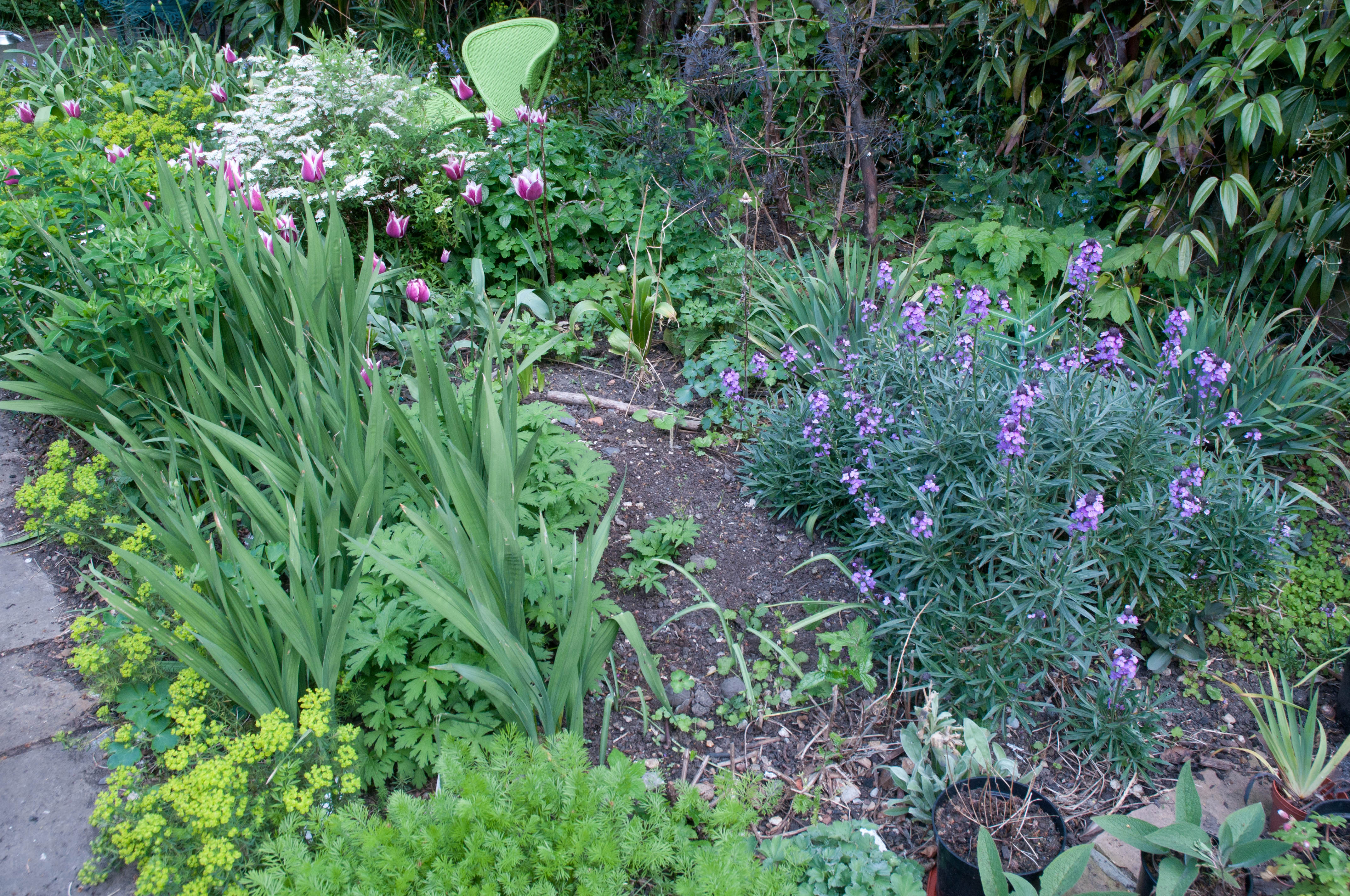 And finally, the problem spot! Read a great blog today from Helen at The Patient Gardener. She’d been to hear Fergus Garrett from Great Dixter talk about successional planting and one of the most important lessons she learnt was to always take notes in your own garden! I know I have Crocosmia and some Echinacea coming up in this area later on in the year, but what should I plant here now? (Any ideas gratefully received). Glad I’ve finally taken a pic of this bed in April as I think I may want to plant some more Tulips here and it will be good to know exactly where to place them later in the year. Another note in my diary to buy Tulips for this bed too.
