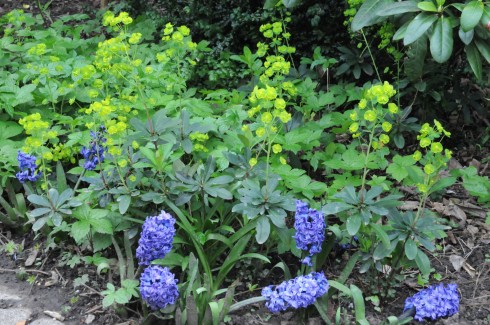 This is from a client’s garden at the edge of a small woodland area. Both plants have such vibrantly coloured flowers that they really dazzle when planted next to each other. Might even try planting more Hyacinths within the Euphorbia next time round.