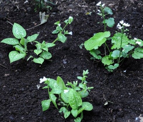 I can’t get enough of Pulmonarias and bought some ‘Sissinghurst whites’ to plant by my Pachyphragma macrophyllum on the right of the photo (big name for such a smallish plant, I know!). Looks like lots of bare earth, but the plants will hopefully spread to form a luxuriant green and white carpet of loveliness in this area soonish.
