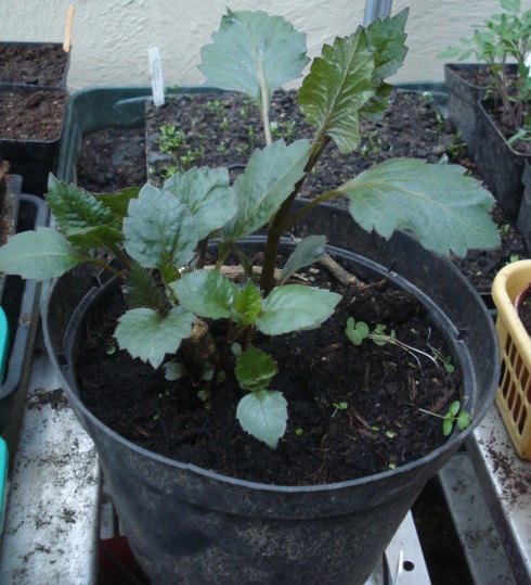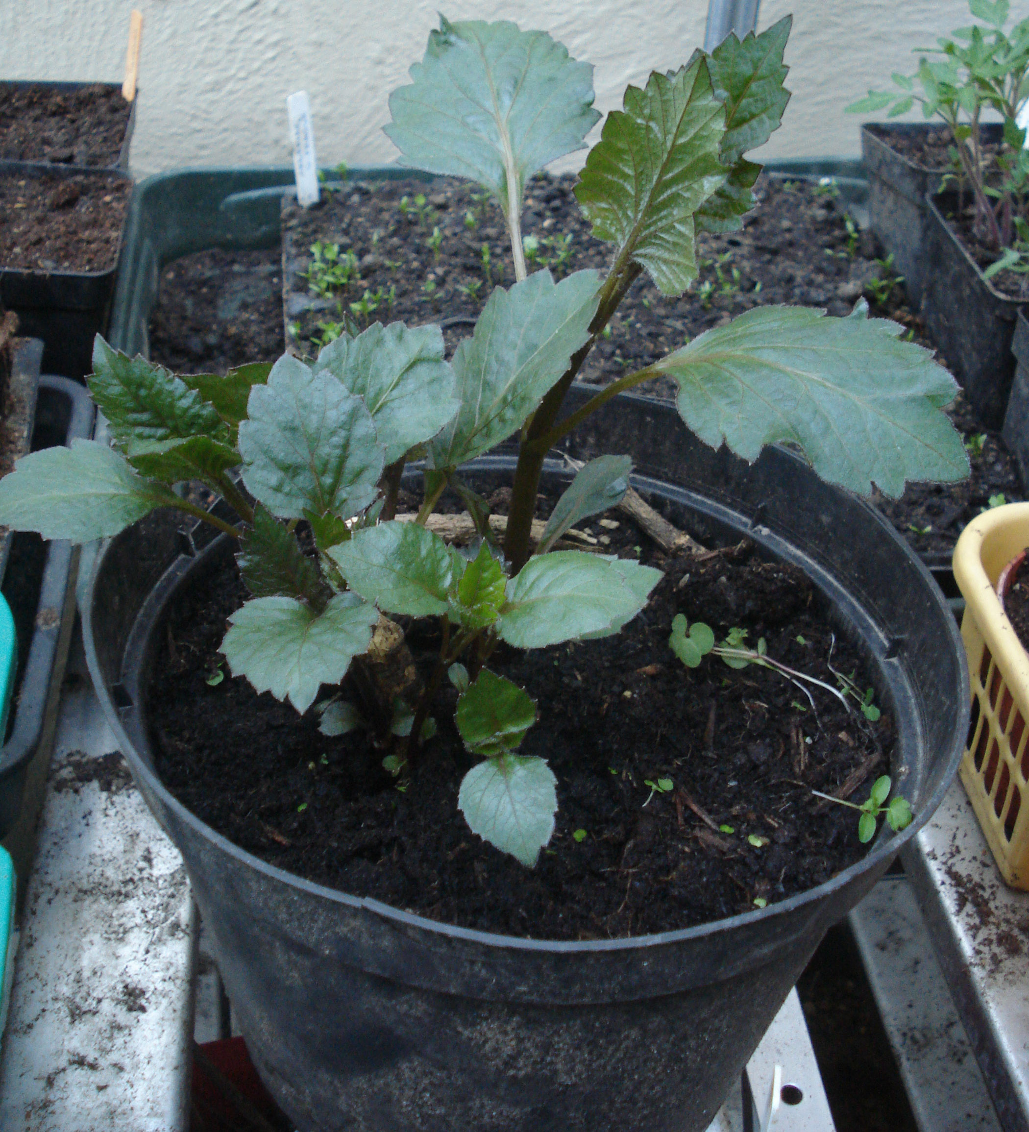 Dahlias look frankly obscene when they have no clothes and none more so now, when they will have spent the past 4 months in the dark and cold. It is time take them out of storage and breathe life into the poor shrivelled specimens. Assuming your excuse of a dahlia clump still has some integrity left (which is to say it is neither a rotten pile of mush or a hollow skeleton, but is still hard, even if some of the tubers are hanging on by the skin of their teeth to the base) all that needs to be done is cut off all the rotten bits, pot them up into good compost, water and place them in a warm place with good light and let the miracle of growth do its thing.