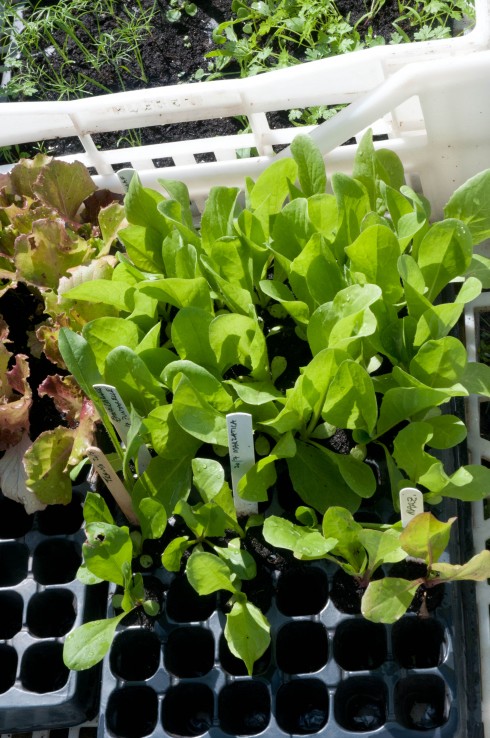 Unlike in his previous farm, Charles doesn’t have electricity in his new greenhouse for a heated propagating mat, so he’s used another hot bed palette (roughly measuring a metre square) to start off seeds in small modules. He’s found that this method works really well, but he needs to re-fill the palette with fresh manure after 6 weeks for a constant supply of heat. He recommends Jack First’s book on hot beds for more information on this intriguing topic. By the way, the leaves above are Puntarelle and Treviso chicories (available from Seeds of Italy).
