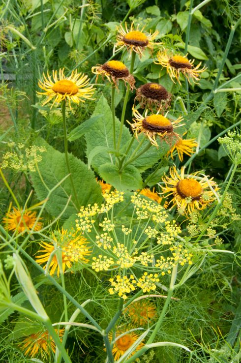 How about the lovely wild mix of floaty fennel and flappy Inula, seen here at the most marvellous gardens at Bryan’s Ground near Hay-on-Wye.