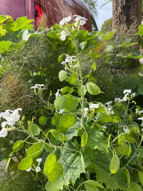 Honesty (lunaria annua) is a wonderful plant for lighting up a woodland corner, or for adding Spring interest to a tree pit (as above). It’s a lovely biennial (supplies leafy growth in year 1, then flowers, sets seed and dies in year 2) which comes in white or a variety of pinks and then produces wonderful seed pods. Above is the early stage of seed pod production. The pods continue to ripen, forming a papery outer layer. Once this is gently prized off, a thin, magical, translucent, mother-of-pearl layer remains, with the seeds attached. Collect the seeds and sprinkle to flower in following years, and you are left with gorgeous, airy seed heads, much admired by flower arrangers. Once more, Chiltern Seeds have some great varieties to sow for the future. Plant now and they will flower next year!