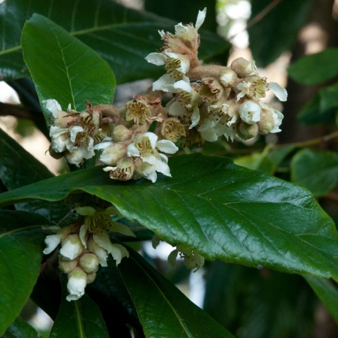 Erriobotya in bloom 2Another evergreen and beautifully architectural largish shrub (or small tree)  is Eriobotrya japonica, also known as a Loquat. More subdued in colour and perfume than the above Camellia, its scent is a real treat when least expected on a frosty morning in November and well into December.