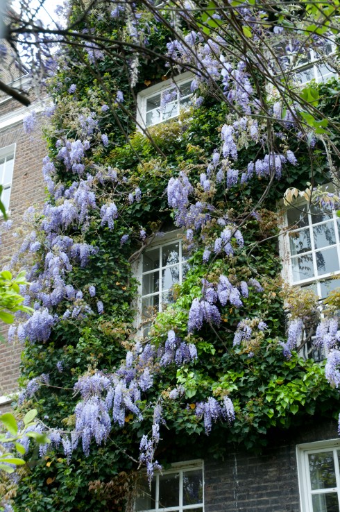 I popped down to the Chelsea Physic Garden recently to hear the marvellous Joy Larkcom talk about unusual veg. The talk was wonderful and inspiring (more about that soon in another post), but I just had to share a few pics of the glorious Wisterias adorning various walls and railings en route in SW3. Take the purple panicles pushing through the railings above. Who wouldn’t want such a magnificent hedge?