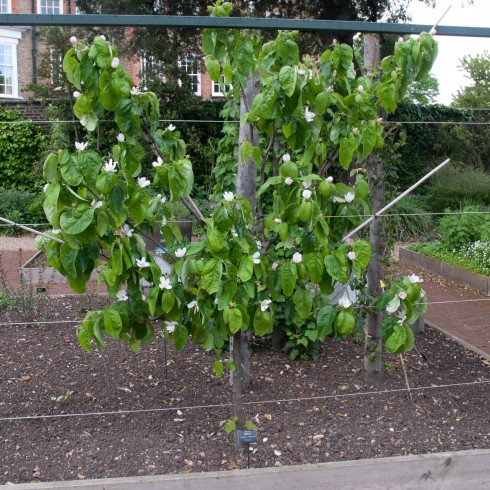 In spring, I went to hear Joy Larkcom talk at the Chelsea Physic Garden, and was completely charmed by their fan trained quince tree (and Joy’s talk of course!). This tree completely fits the bill. The blossom in May was huge and enchanting and I was equally smitten by its large leaves. The supports here are approximately 3m wide and the tree at the moment is maintained to about the same height too.