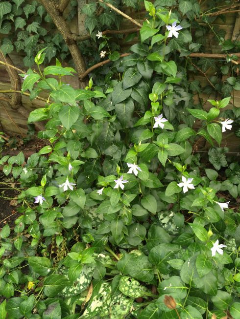 And evergreen foliage, which always looks vibrant and fresh. Its generous-sized flowers are a very pleasing pale violety blue, which flower from December until April or May and then again intermittently for the rest of the year. What’s not to love! This is no delicate little periwinkle. It’s a robust plant that grows to about 60cm high and it’s even starting scrambling much higher up an old tree trunk. As with other Vincas, it’s happily romping away in its shady spot, but it’s easy to pull up (and transplant elsewhere) if it’s getting a little too exuberant.