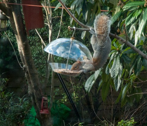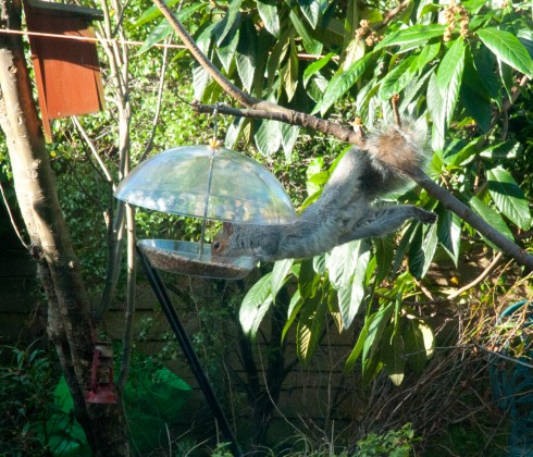 squirrel acrobatically noshing from squirrel proof bird feederMeanwhile, other antics in the garden are not quite so pleasing. Here’s a furry beast gorging itself from a squirrel-proof bird feeder,