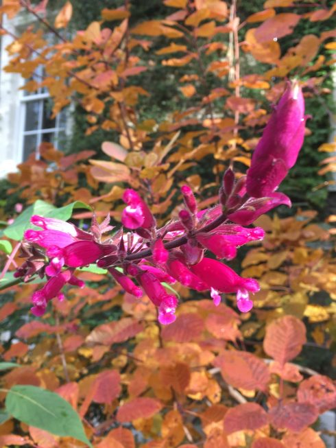 And if you have a larger garden (which sadly I don’t!), you could grow this stunning Salvia involucrata ‘Bethellii’ which will occupy a chunky space of about 2 meters high and wide. Again the leaves are wonderfully scented and it flowers and flowers, right up until the end of November-shown here with a Cotinus in the background turning orangey-red in autumn. Eventually the long stems collapse after the first frost and are all cut back, but the plant is carefully mulched with a generous helping of manure to ensure that we see it in Spring again.