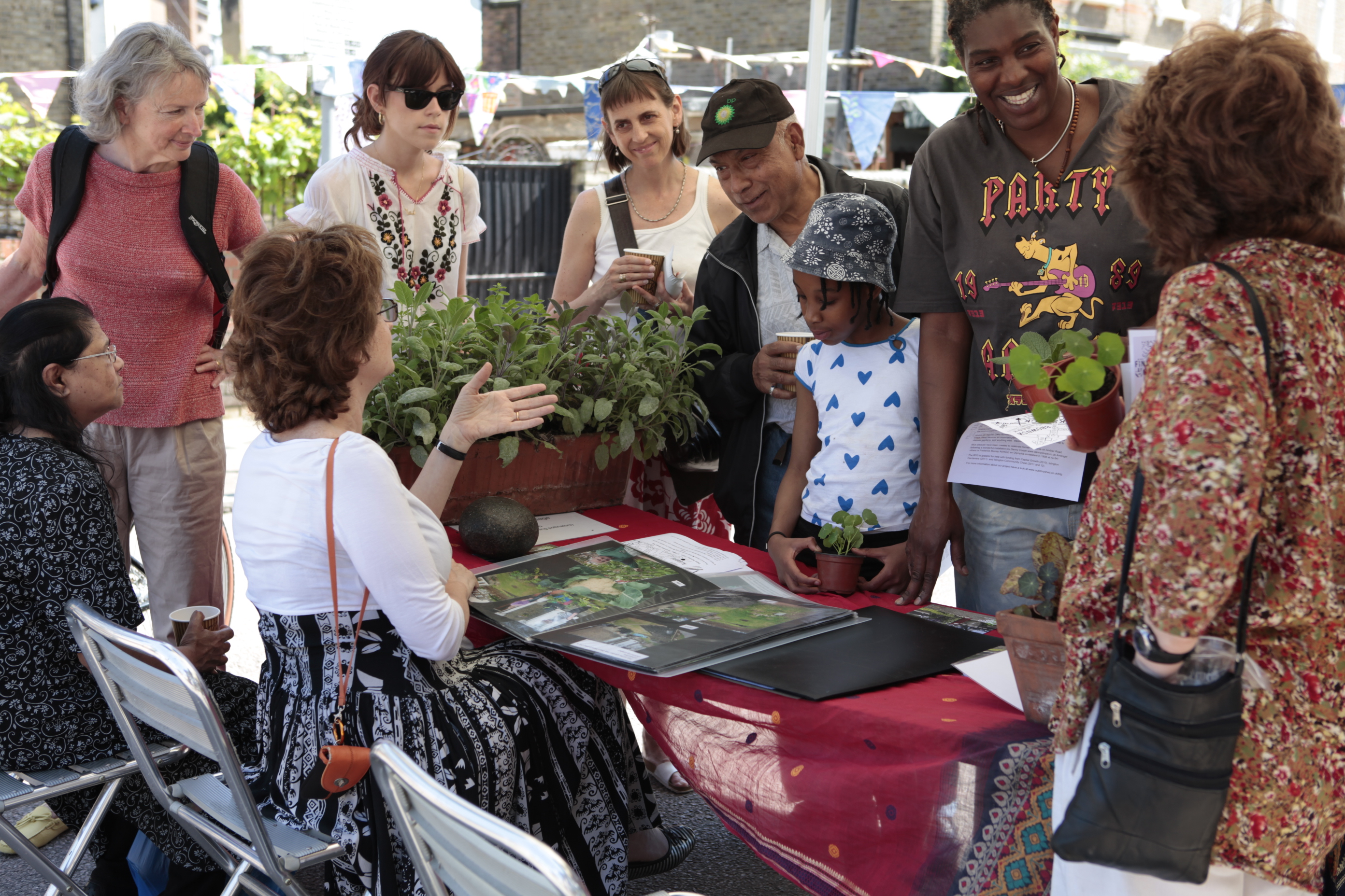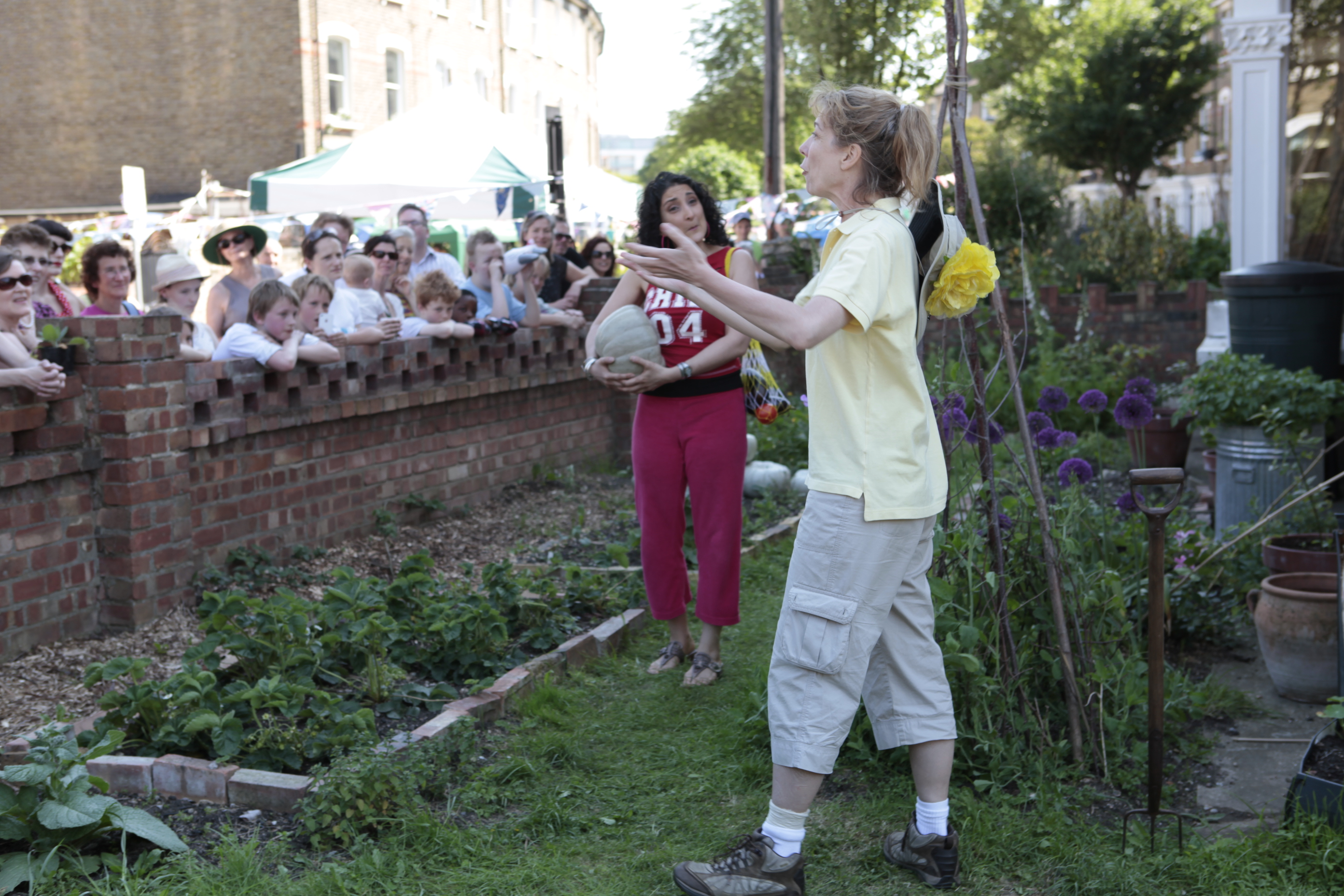 As rain and cooler weather are predicted for the coming Jubilee weekend, I was reflecting on how lucky we were with exceptional weather for our Chelsea Fringe event last Sunday. Neighbours in our community veg growing scheme have been getting together at ‘Cake Sundays’ a couple of times a year since 2009, for a seed give-away and to catch up with each other over tea and home-made cakes. This May, as part of the Chelsea Fringe, we invited others to join us and put on a bumper spread with oodles cakes and bunting. It was a really enjoyable afternoon.