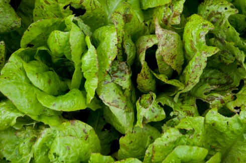 Just read a fab post by Michelle at Veg plotting about leaves that can take all this damp weather we’ve been having and one of her images was of this beauty Cos ‘Freckles’. I  noticed this variety in Sarah Raven’s catalogue last year as it needed ‘plenty of water, but not too much sun’. I couldn’t have predicted the weather (or hose pipe ban!), but I hoped it might do well on a bit of ground that only gets 3 or 4 hours of sun in the morning. I merrily sowed seeds in modules at the end of February, planted them out about 6 weeks later in our community front garden and have been happily picking and eating them for the last month or so, and sharing the bounty with a few other neighbours too. Following Charles Dowding’s advice, we pick the outer healthy leaves, leaving the small inner leaves to carry on growing, enabling us to harvest over a longer period.