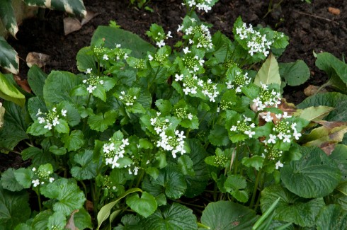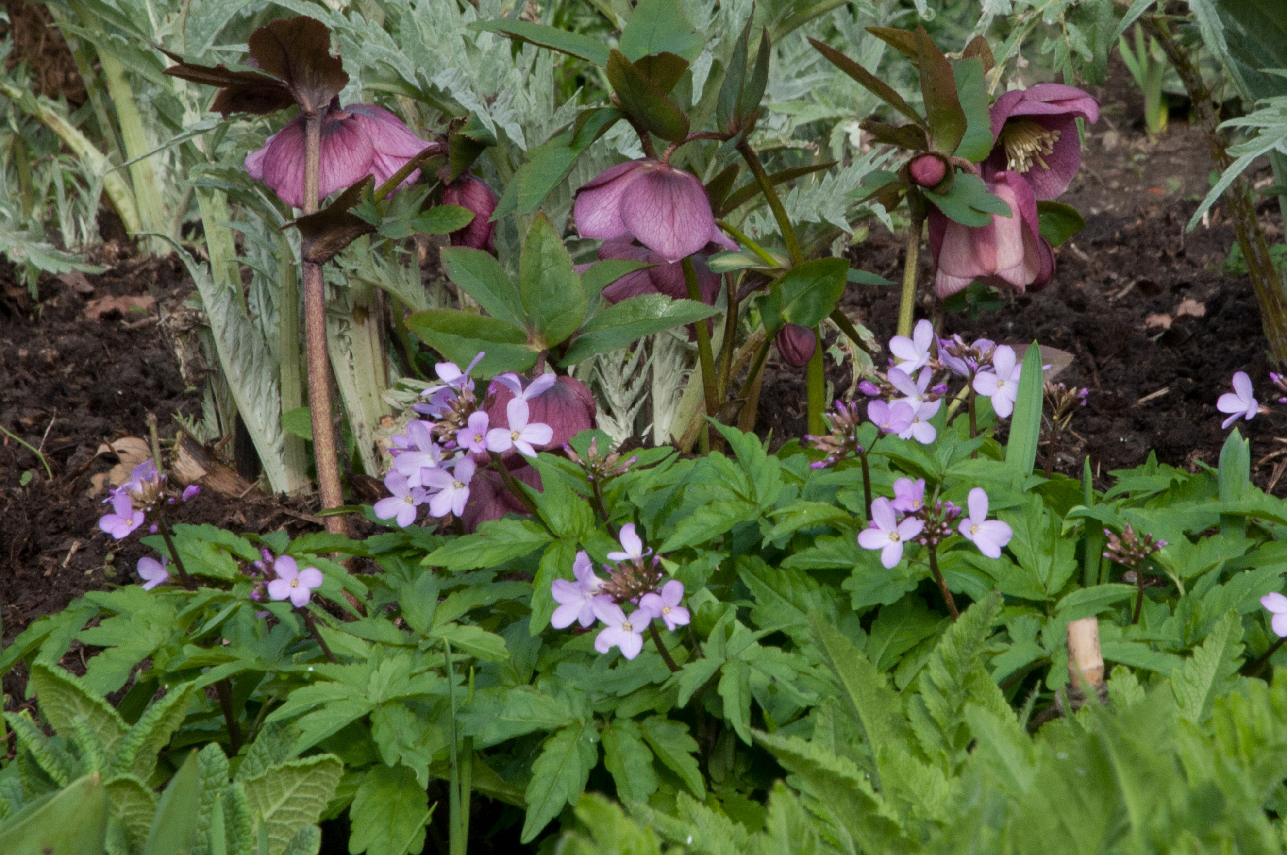 Cardimine quinquefolia, above, and appearing in many areas of the gardens at this time of year, is altogether a much more delicate affair and a fantastic companion to a purple Hellbore or a dark-leaved Bergenia.