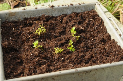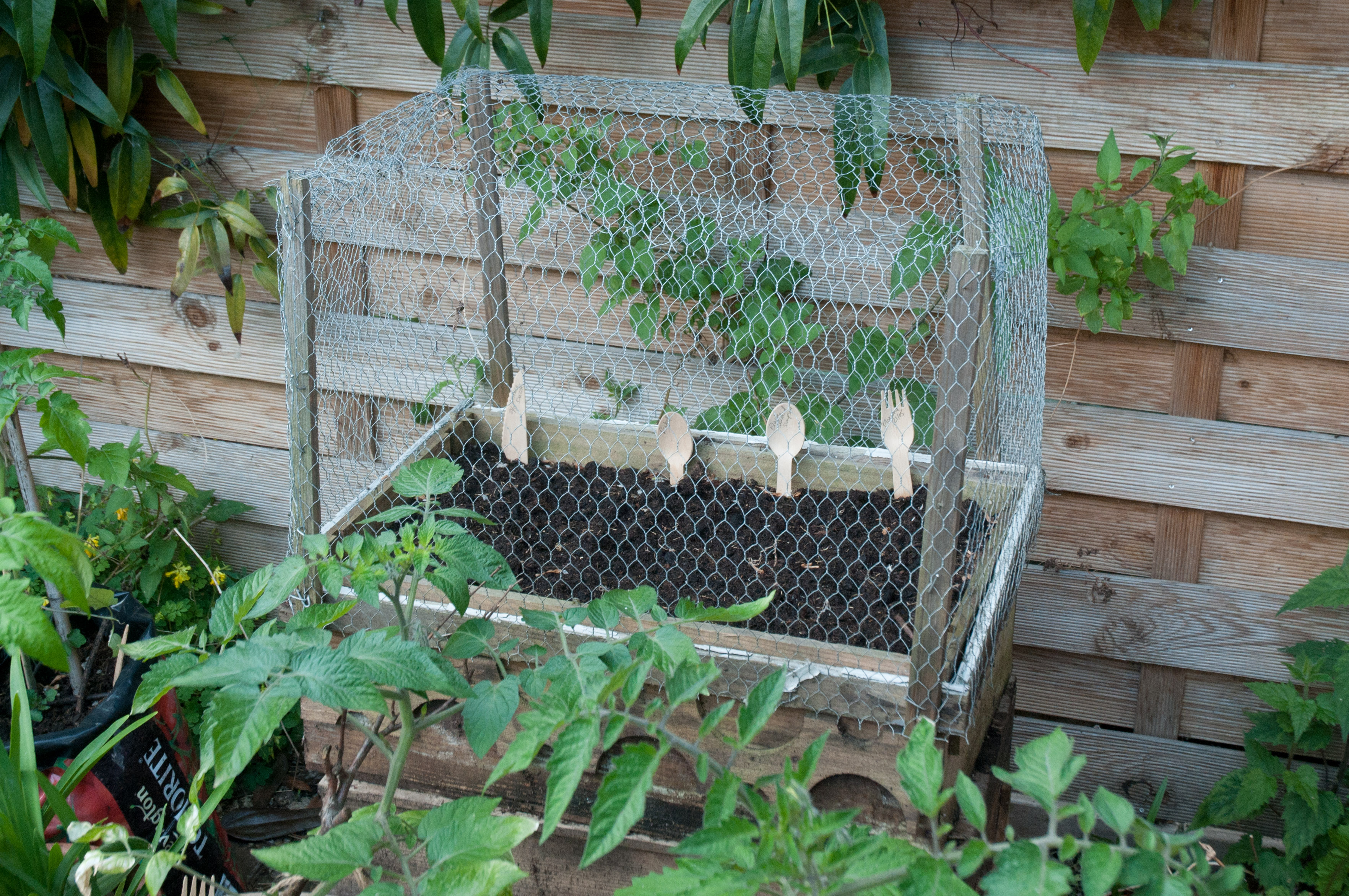 After years of squirrels digging up freshly planted pots in my back garden and then chomping away at newly emerging flower heads for afters, I have built some mini cages to neatly fit on some old wine boxes so that I can still grow my favourite salad leaves by the kitchen door. Once the lettuces etc. are of a decent size and can look after themselves, I can remove the cage. Simple to make. All you need is some chicken wire, nails and a 8 small pieces of thin wood (these were reclaimed from a nearby skip). First, cut and then nail the base pieces of wood together to fit around the wooden box, then nail on the 4 upright pieces of wood to the base. Shape and position the wire around the wooden framework and then nail the wire onto the base. Mine’s getting a bit rickety, but still really does the job.