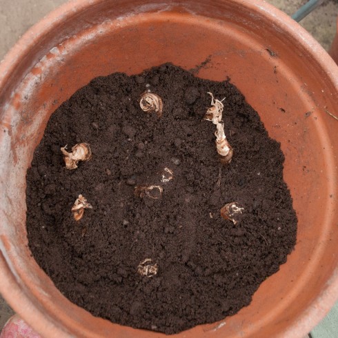 And then cover with the compost, just leaving the top of the bulbs visible. I use John Innes compost as it’s soil based and holds on to moisture and nutrients better than multi-purpose compost. If you only have multi-purpose soil to hand, then it should be ok, but keep an eye on it to make sure it doesn’t dry out. Or you could mix the two composts together if you’re running short of one or the other.