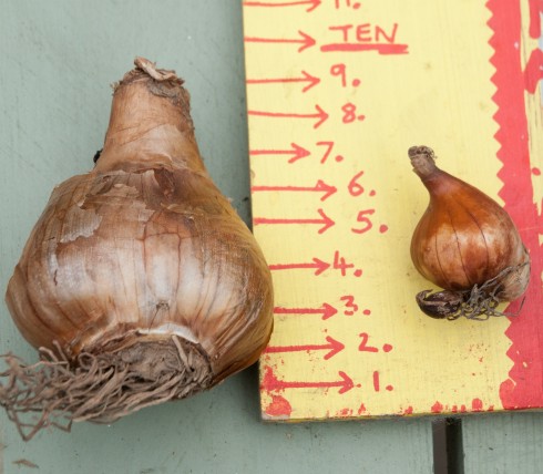 Narcissi bulbs vary widely in size as you can see with the whopper Red Devon (above left) measuring 9cm (3.5 inches), compared to the species Narcissi canaliculatus bulb which is just over 3 cm (an inch). As a rule of thumb, bulbs should be planted to approximately 3 times their depth so bear this in mind when calculating how deep to plant your bulbs and what size pot to use.