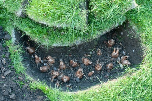 And if you’re going to plant in a grassed area and have a large number of bulbs to plant, plant in clumps. To do this, using the sharp edge of a spade (and some chalk spray or carefully scattered flour), define small areas within the whole that you’re going to plant.