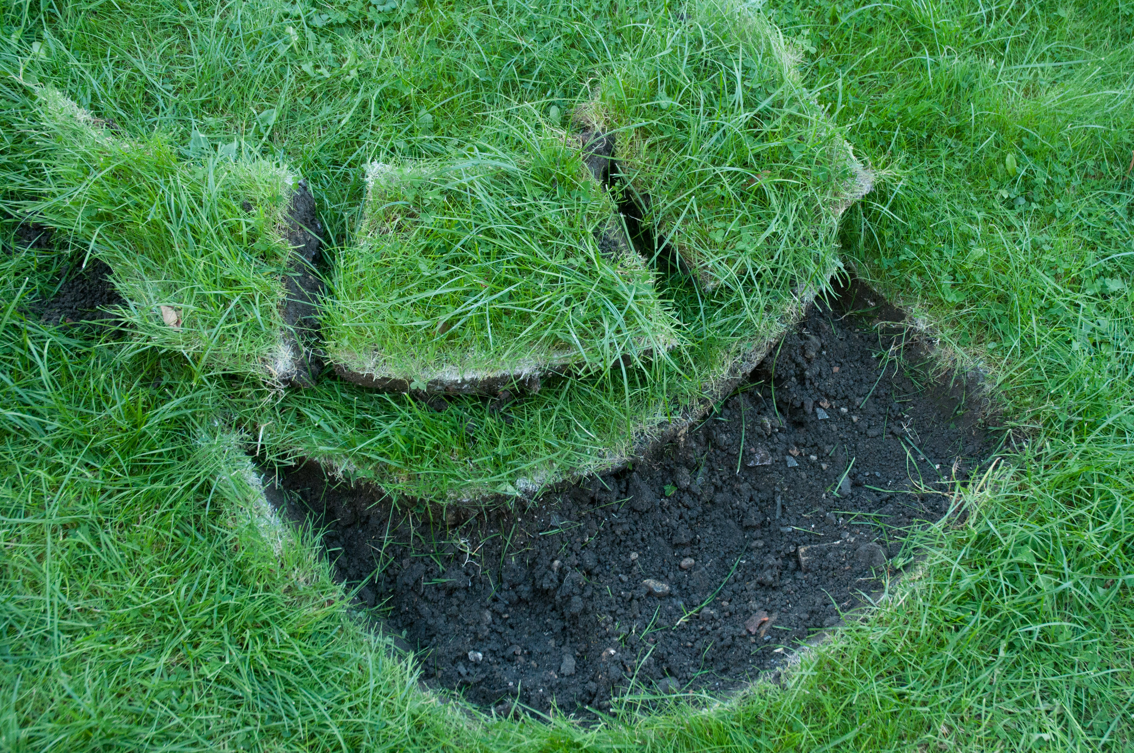Finally, replace soil and grass, then tread in the grass so that the roots make contact with the soil beneath and water in.