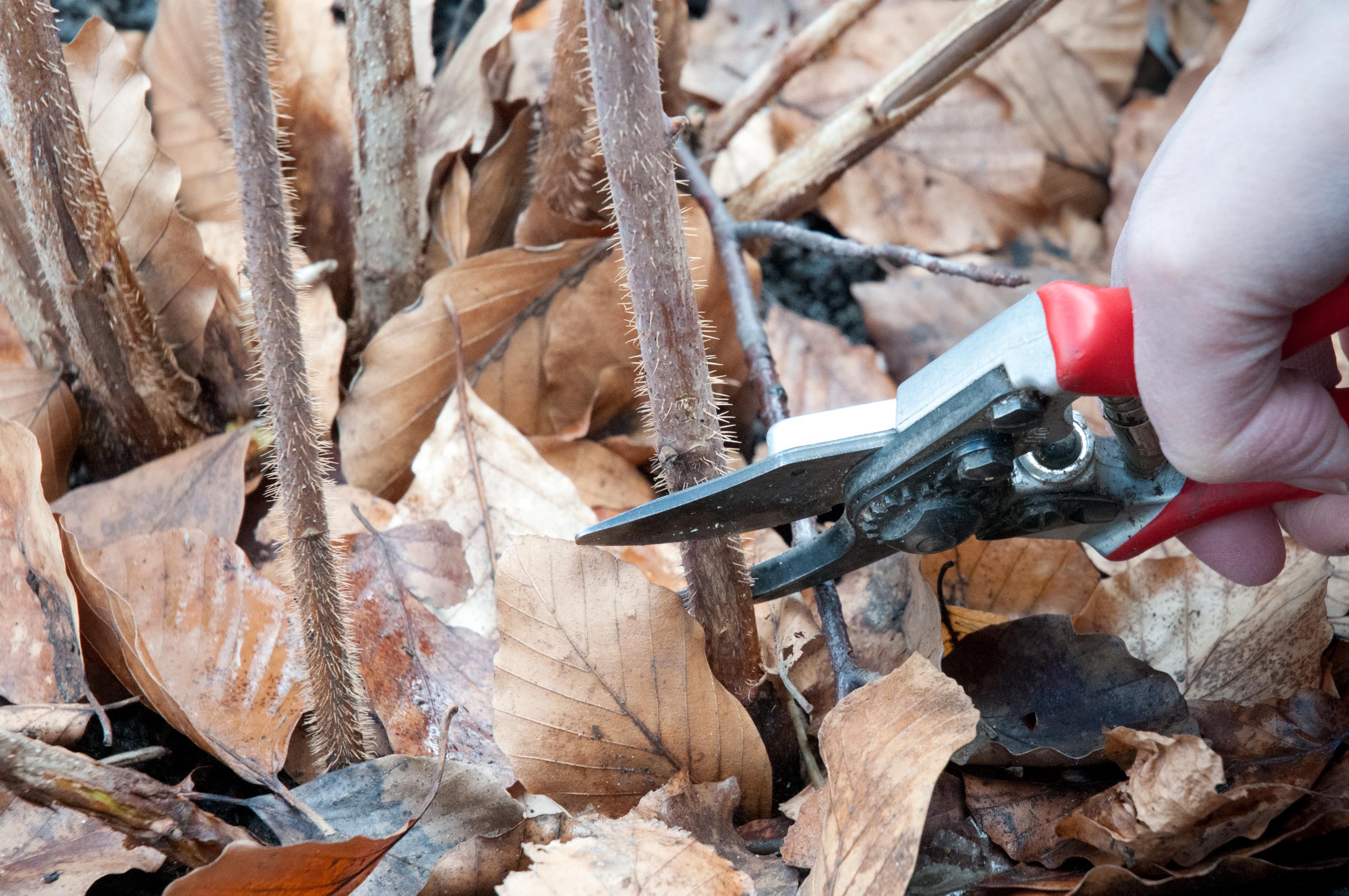 So firstly, cut back all of the canes with a sharp pair of secateurs, as close to the ground as possible.