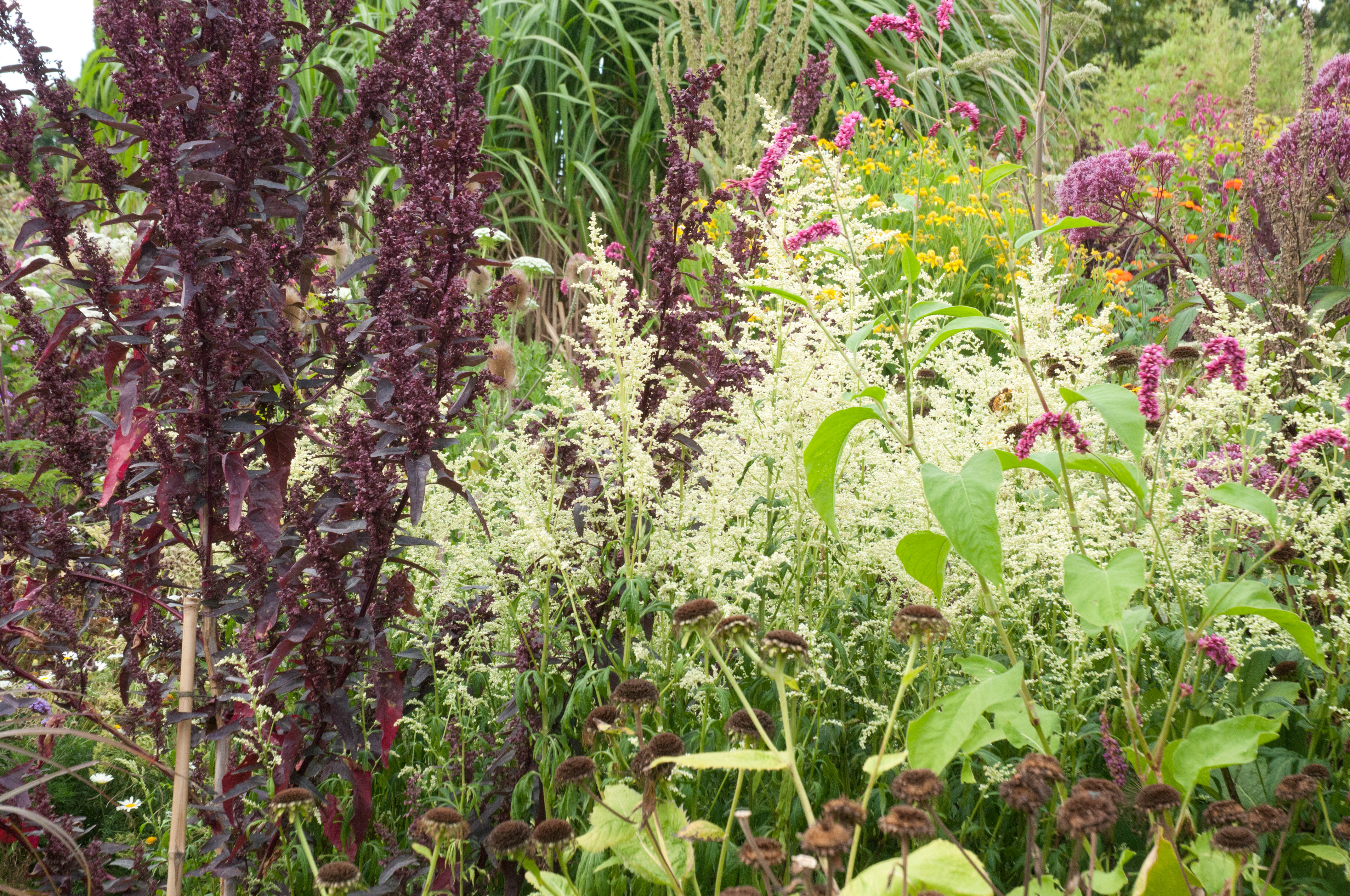 Creamy, or should that be dreamy Artemesia lactiflora (available from Great Dixter Nursery) sits wonderfully in a border surrounded by the scrunchy flower heads of the purple leafed Atriplex hortensis (Chiltern’s Seeds), the pink nodding heads of Persicaria orientalis and the deeper pink heads of Eupatorium Riesenschirm (Great Dixter Nursery).