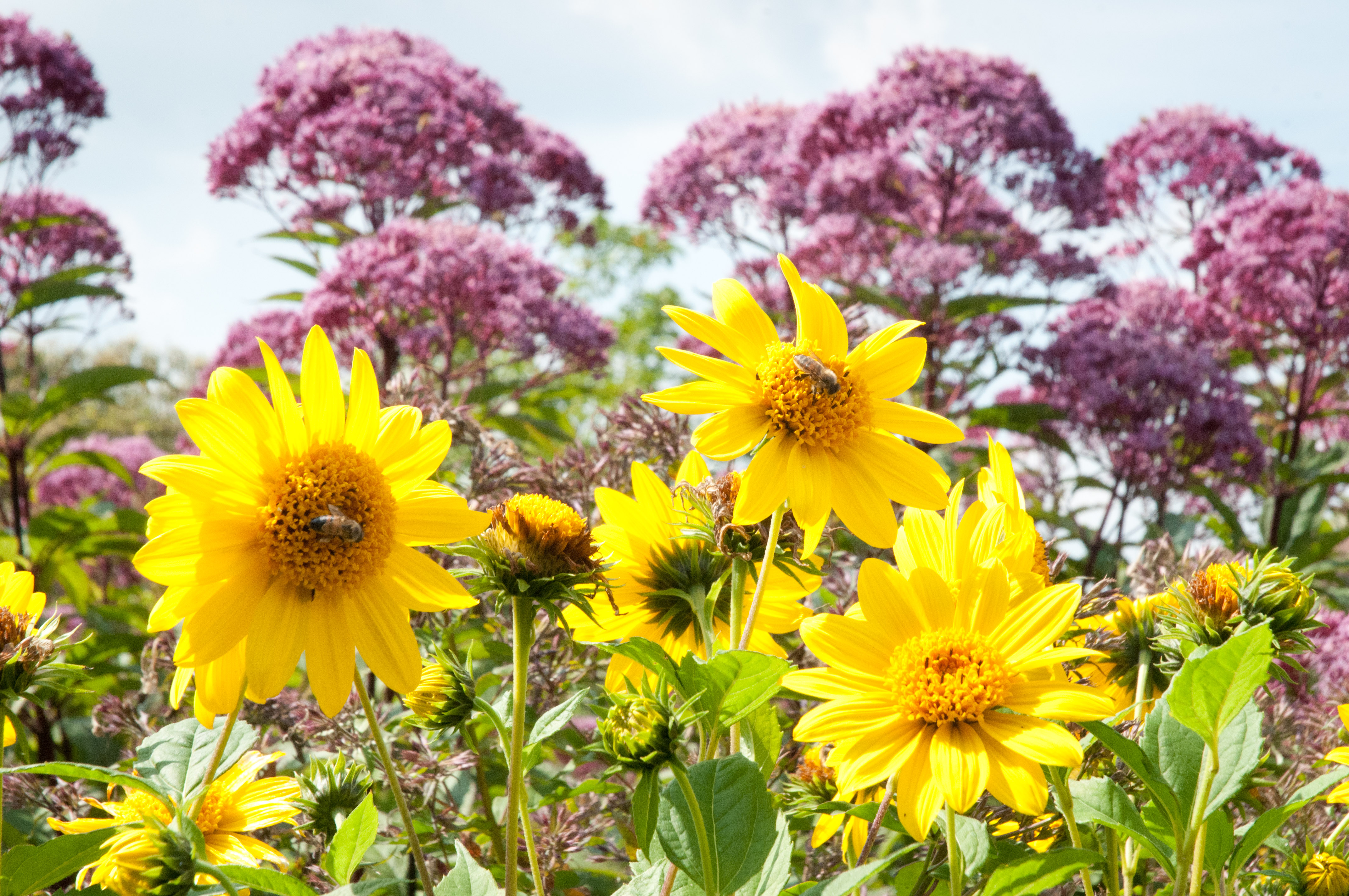 And around the corner the same Eupatorium Riesenschirm provides a wonderfully contrasting background for Helianthus ‘Capenoch Star’ (Great Dixter Nursey).