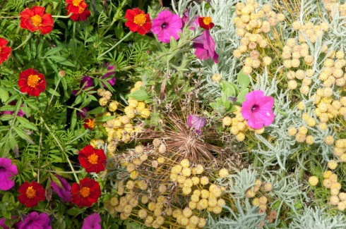 In the long border, the glowing red (and feathery leaves) of the annual Tagetes ‘Cinnabar’ creates an arresting combination alongside a shocking pink Petunia and the faded yellow miniature pompoms of Santolina pinnata subsp. neapolitana (available from the Great Dixter Nursery).