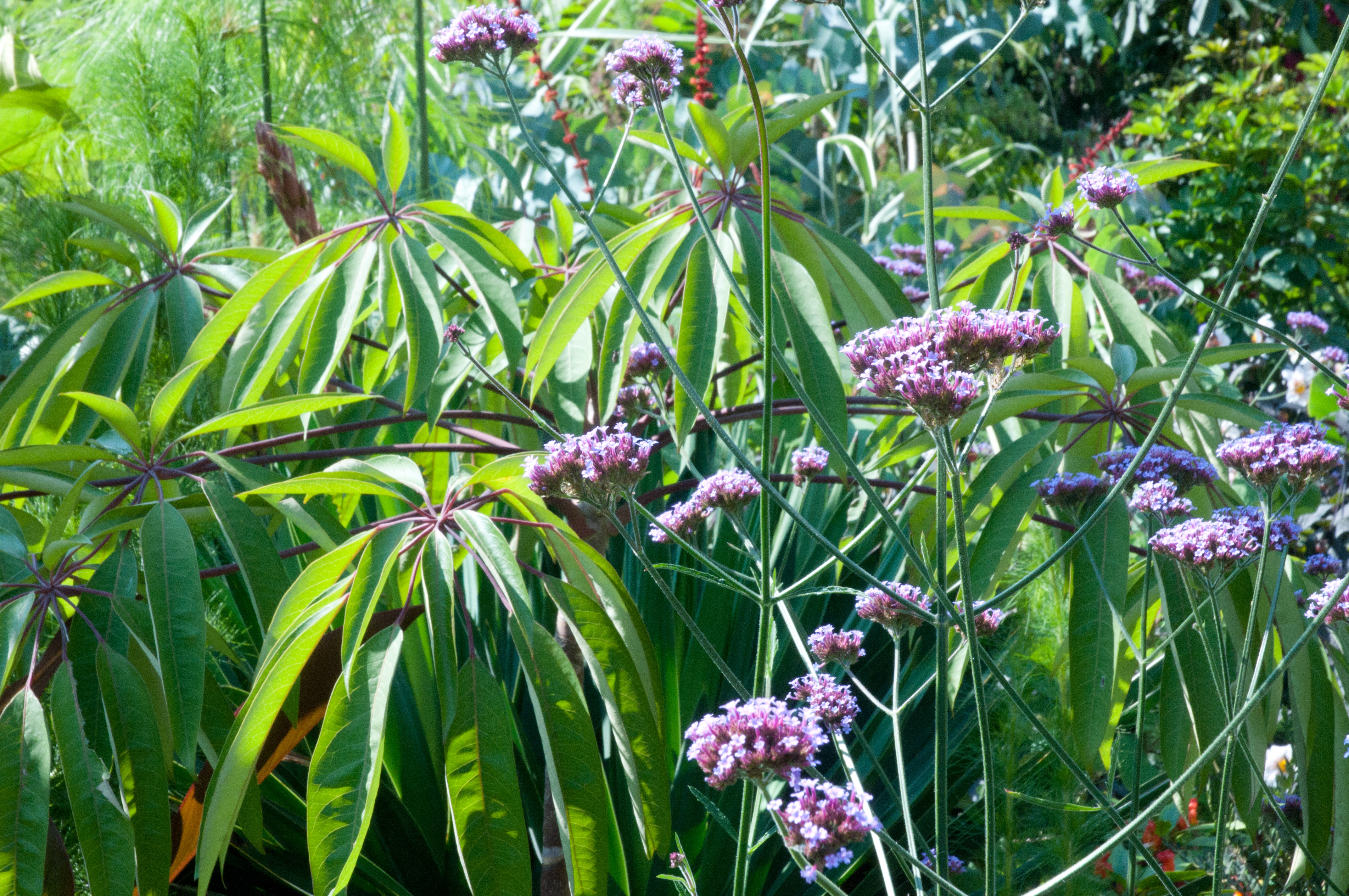 Through the floating purple heads of Verbena bonariensis, a Schefflera, possibly Schefflera Hoi?-available from Crug Farm plants, is visible in the Exotic garden.