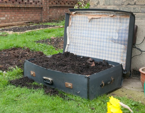 Whilst on our travels we came across this fab suitcase which will make a great mini raised bed. Perfect for some Swiss chard I think! We quickly drilled some holes in the bottom and filled it up with compost ready for planting. It may not last many years, but should see us through this growing season at least.