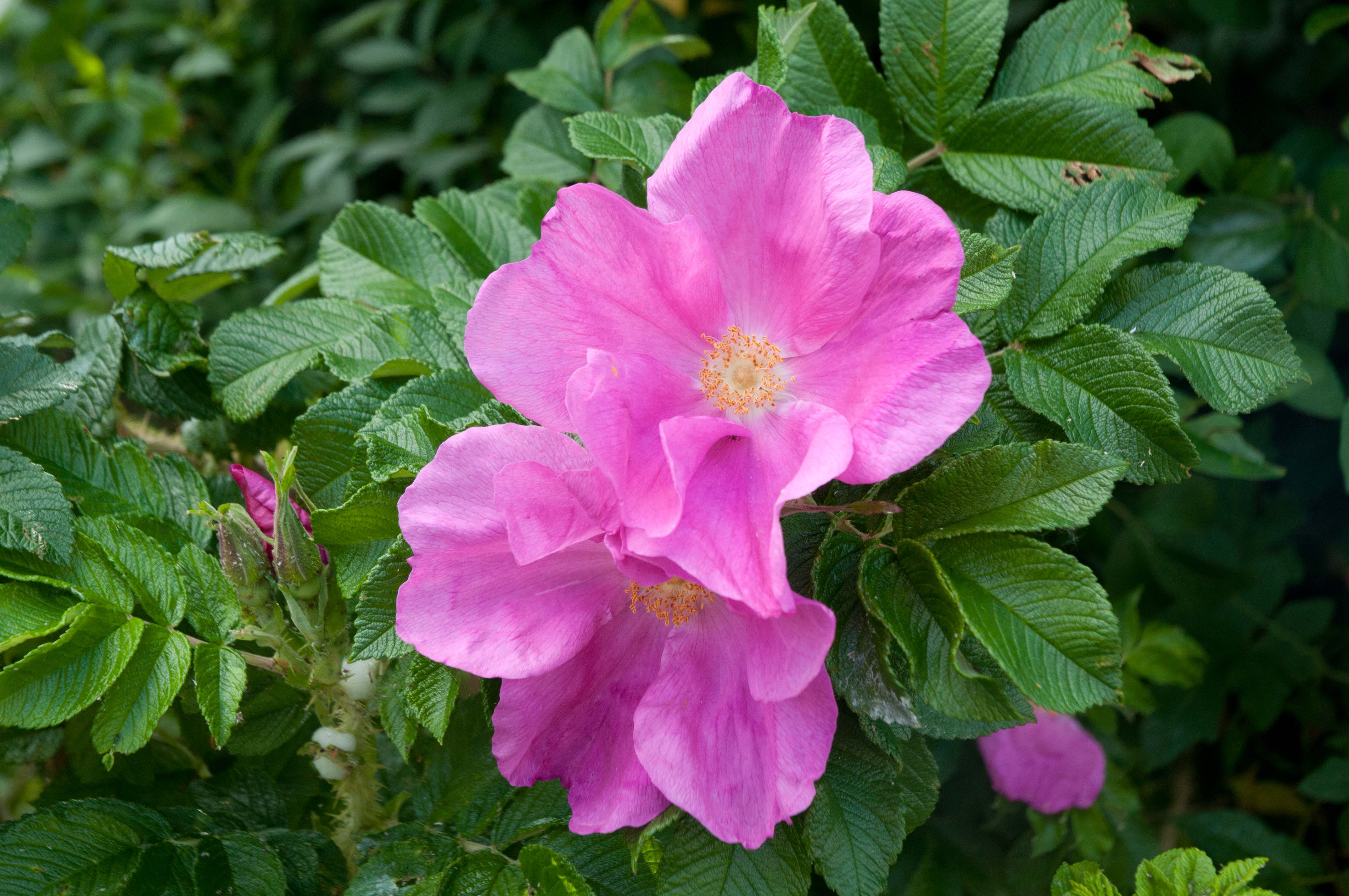 On a recent trip to the Essex coast, I couldn’t but help notice this gorgeous rose-Rosa rugosa ‘Scabrosa’ (kindly identified for me by the lovely people at Peter Beales Roses) in somebody’s front garden, used for fragrant hedging-and what a wonderful hedge! Checking out Rosa rugosa (without the Scabrosa, but still with gorgeous pink flowers) on the Peter Beales website, revealed its true versatility. As a single flowerer, this rose is very attractive to bees and wildlife (Carol Klein talked about the importance of growing single flowered plants only this Friday on Gardeners World, in order to feed our declining bee population), is highly scented, very disease resistant,  will grow on any soil, can take some shade, flowers all summer long (unlike many other wild roses which come and go all too swiftly), has gorgeous pink blooms and large red hips…..what’s not to love about this fabulous rose. (Height 4ft x Spread 6ft)