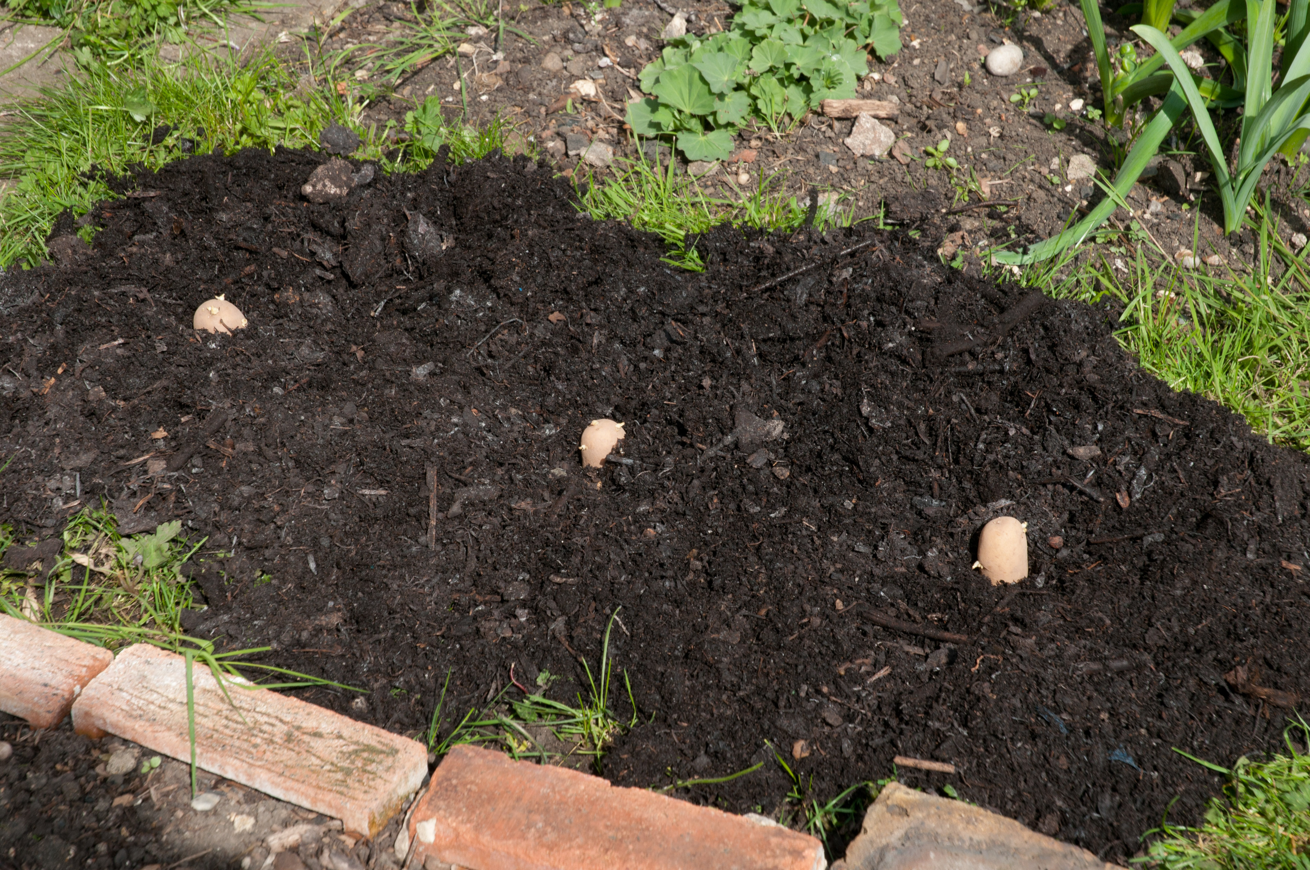 A neighbour had some spare chitted ‘Charlotte’ seed potatoes when I got back from my Easter holiday, and inspired by Charles Dowding growing potatoes straight onto grass, I decided to give this a go. Now I do remember Charles Dowding saying that he weakened the grass first by covering it with cardboard for a few weeks (or was it months?) before starting, but the potatoes were ready to grow, so I thought I’d just give it a go. I simply put some compost on top a spare bit of grass, nestled the seed potatoes into the compost and then covered them with about another 6 inches worth.