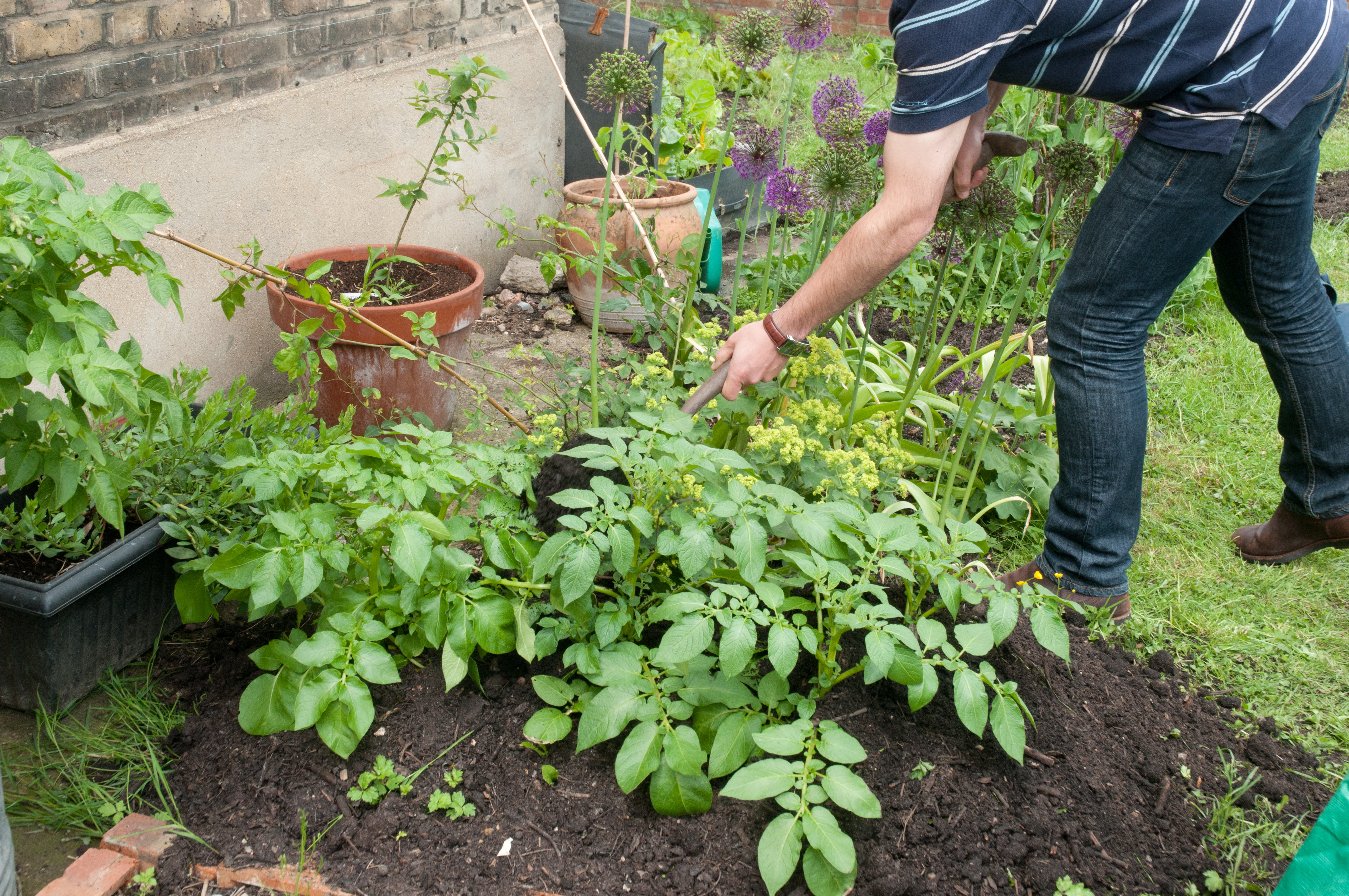 About 7 weeks later, my spuds are coming on really well and neighbour Henry helped me to earth the trio up, carefully covering most of the new foliage with extra compost.