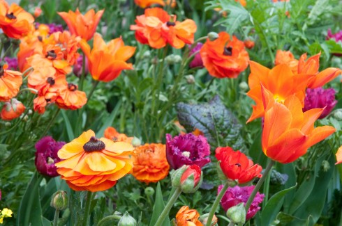Last year I had such fun experimenting with Tulip combinations, that I’m very excited about choosing what to try out this year. Above (and in my banner pic), are Tulipa ‘Ballerina’, a wonderful Lily shaped Tulip and the Fringed, ‘Curly Sue’. Mixed with the purple leaves of some overwintered mustard leaves and the joyous heads (and feathery foliage) of Ranunculus, these bulbs had passers coming to a halt to gaze at the explosion of colour.