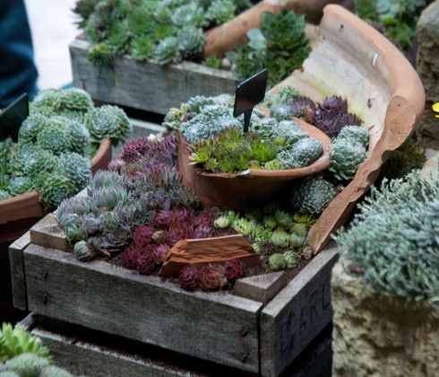 Further travels around the show revealed the creative use of recycled objects and pots on the D’Arcy and Everest alpine stand,